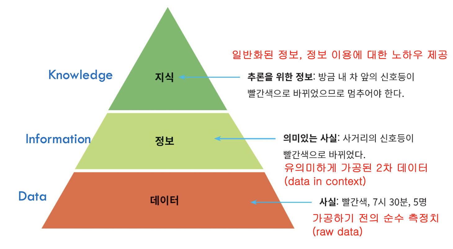 Knowledge: 일반화된 정보, 정보 이용에 대한 노하우 제공 ex) 방금 내 차 앞의 신호등이 빨간색으로 바뀌었으므로 멈추어야 한다